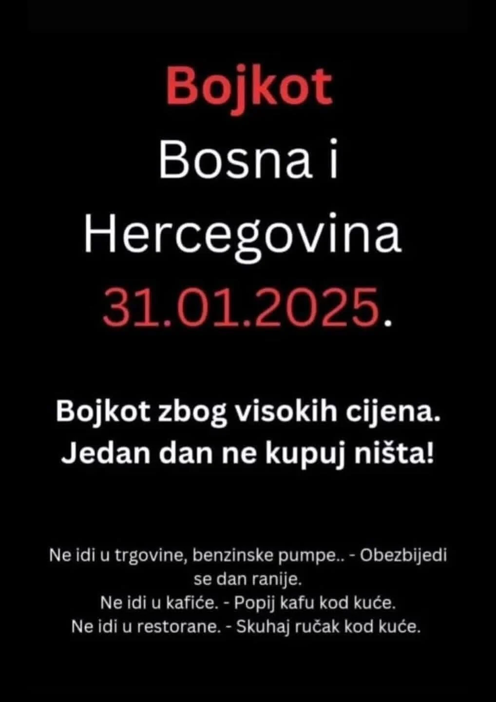 "Bojkot zbog visokih cijena. Jedan dan ne kupuj ništa! Ne idi u trgovine, benzinske pumpe.. - Obezbijedi se dan ranije. Ne idi u kafiće. - Popij kafu kod kuće. Ne idi u restoranu. - Skuhaj ručak kod kuće", navodi se na posteru sa crnom pozadinom u kojem se poziva na bojkot dana 31. 01. 2025.