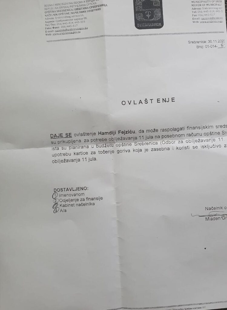 Kako Raport saznaje, načelnik Opštine Srebrenica Mladen Grujičić odlučio je da izda 'Ovlaštenje' po kojem Fejzić - sad kao fizičko lice - idalje može upravljati podračunom namjenjenim za finansiranje komemoracije!