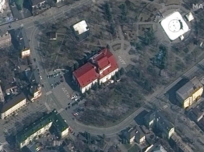 Kristof Kotl (Christoph Koettl), novinar New York Timesa, je na Twitteru objavio fotografiju satelit tvrtke Maxar, na kojoj se vidi da je napisana riječ "djeca" na ruskom na prednjoj i stražnjoj strani pozorišta. Navodi se da je snimak nastao prije dva dana.