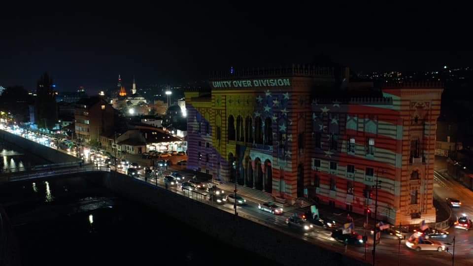 "Vijećnica večeras svijetli u čast istinskog i dokazanog prijatelja naše zemlje, novog predsjednika Sjedinjenih Američkih Država Joea Bidena", rekao je gradonačelnik Sarajeva Abdulah Skaka.