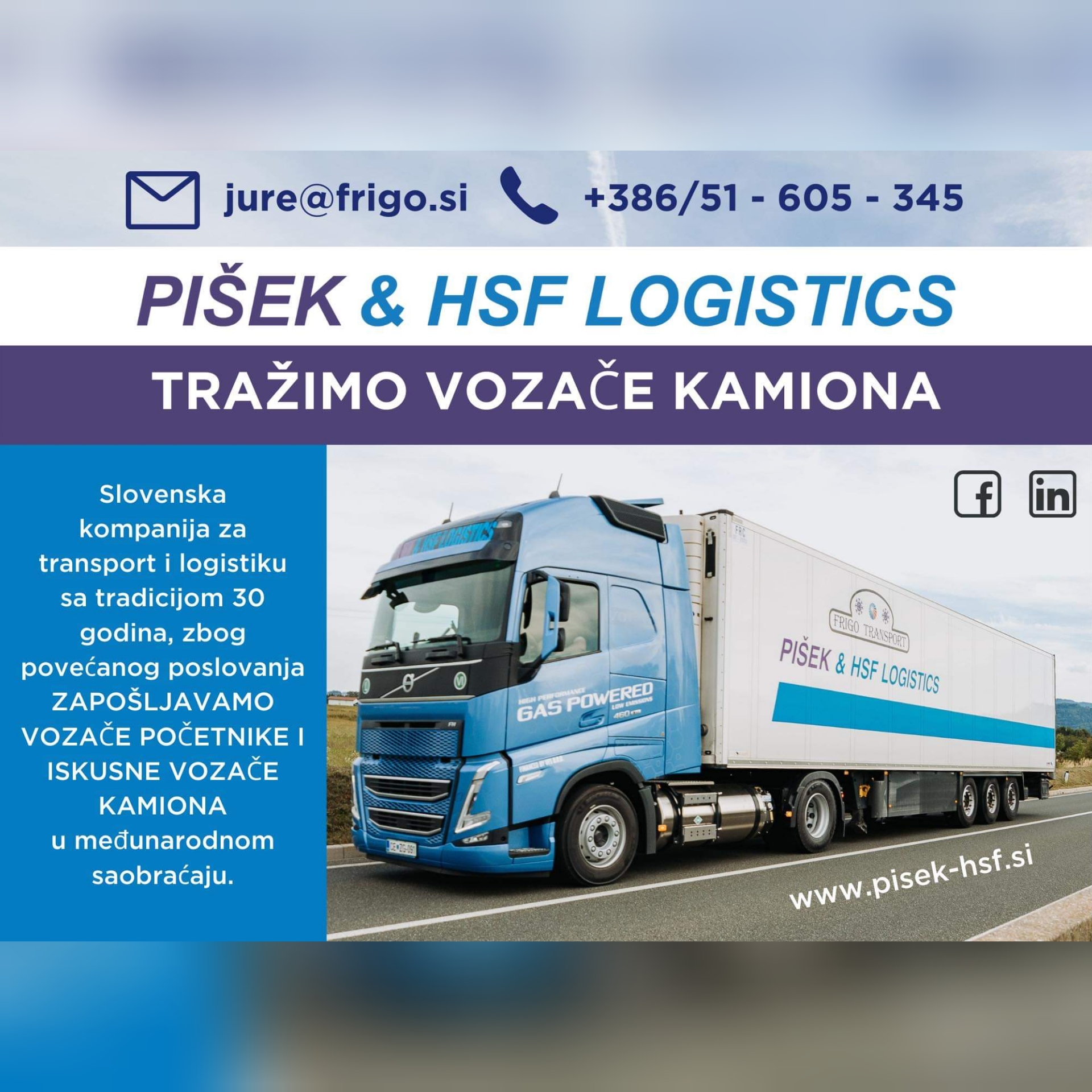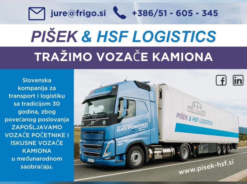 OGLASI 04 Feb, 2022 - 12:59 / Uredio: AzraS / 0 Comments Slovenska firma traži vozače kamiona - oglas za posao Renomirana slovenska kompanija za transport i logistiku, sa tradicijom 30 godina PIŠEK & HSF LOGISTICS traži vozače kamiona. Zbog povećanog poslovanja zapošljavamo VOZAČE POČETNIKE i ISKUSNE VOZAČE KAMIONA u međunarodnom saobraćaju. Kontaktirajte na: E- mail: jure@frigo.si Telefon: +386/ 51 605 345 Related Articles OGLASI 22 Aug, 2025 Bellona traži odgovornu i motivisanu osobu za poziciju dostavljača/montera OGLASI 03 Aug, 2025 Kako brzo zaraditi 7.950 dolara dnevno, najbolja i najstabilnija investicijska platforma HJT Crypto u 2025. (pogodno za sve) OGLASI 23 Jul, 2025 LottoPark – Najveće svjetske lutrije online na jednom mjestu OGLASI 18 Jul, 2025 How to Select the Best P2P Crypto Exchange: 5 Key Aspects That Matter OGLASI 09 Jul, 2025 Najčešći mitovi o klađenju na košarku i zašto im ne biste trebali vjerovati OGLASI SVIJET 25 Jun, 2025 Mark Rutte se pokušao "izvaditi" zbog komentara o Trumpu: "Nisam ga nazvao taticom"