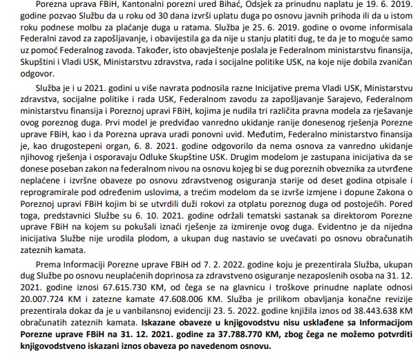Služba je 25.6.2019. godine o ovome informirala Federalni zavod za zapošljavanje, i obavijestila ga da nije u stanju platiti dug, te da je to moguće samo uz pomoć Federalnog zavoda. Također, isto obavještenje poslala je Federalnom ministarstvu finansija, Skupštini i Vladi USK, Ministarstvu zdravstva, rada i socijalne politike USK, na koje nije dobila zvaničan odgovor - stoji u revizorskom izvještaju za 2021. godinu i dodaje: