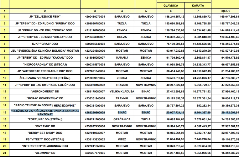 Među poreznim obveznicima koji duguju državi po osnovu poreza, doprinosa, taksi i drugih naknada nalazi se i Služba za zapošljavanje Unsko-sanskog kantona Bihać.