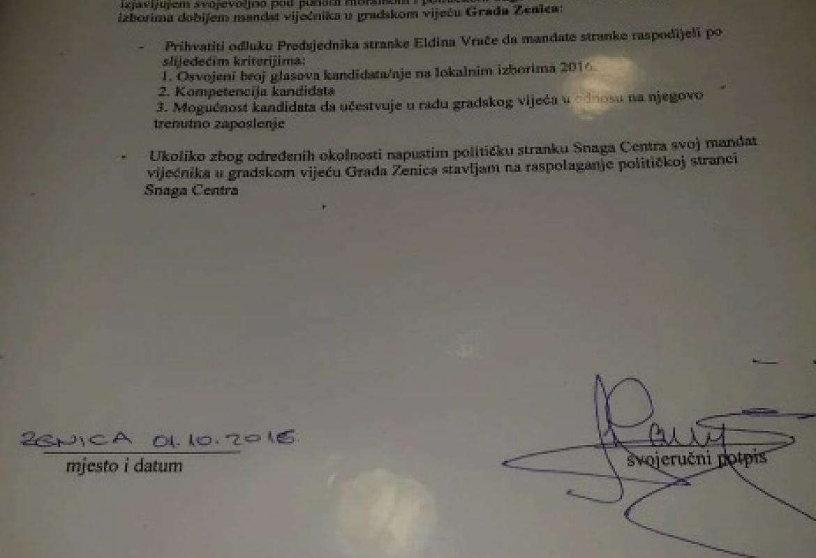 "Snaga centra Zenica poziva javno ove takozvane ‘moralne vertikale’ da prestanu pljuvati po svom potpisu i ovjeri, te javnosti dokažu svoju toliko puta rečenu dosljednost. U prilogu ovog saopćenja iznosimo vlastoručno potpisane i ovjerene izjave kojima su se obavezali da će, ukoliko napuste Snagu centra, vratiti mandat stranci koja ga je i osvojila. Poštujemo i odluku dvojice članova porodice visokog zvaničnika SDP-a da se, radi mira u svojim domovima, ipak vrate i pod političko okrilje porodičnog stabla, ali glasači Snage centra, im nisu dali mandat da ga nose u miraz svom puncu", dodaju iz Snage centra.