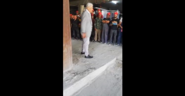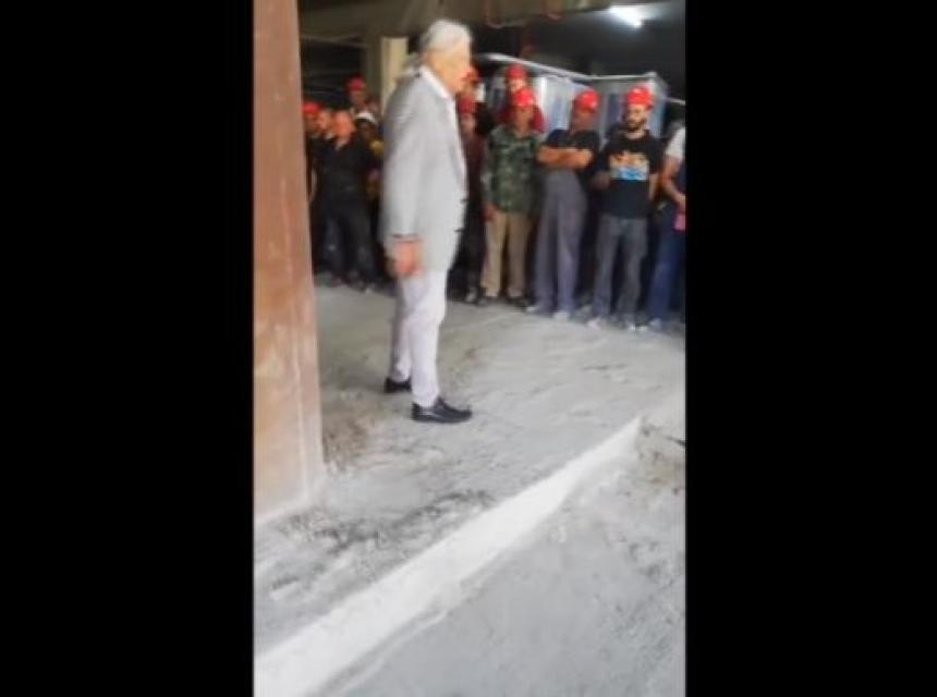 Na snimku se vidi muškarac koji se obraća okupljenim radnicima koji su, kako se pretpostavlja, učestvovali u izgradnji Kliničko centra Srbije.