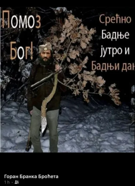 Na Facebook stranici Gorana Broćete, bivšeg gradonačelnika Drvara (2016-2018.) i sadašnjeg zastupnika Saveza nezavisnih socijaldemokrata (SNSD), stranke Milorada Dodika, u skupštini Livanjskog kantona, u ponedjeljak je na pravoslavni Badnji dan osvanula božićna čestitka s pozdravom “Pomoz’ Bog” i fotografijom muškarca u četničkoj odori koji u rukama drži badnjak, sjekiru i pušku.