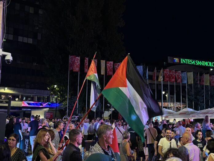 Na ulici ispred festivalskog trga okupljeni su građani i aktivisti održali skup za Palestinu, vijoreći zastave i podižući glas solidarnosti s palestinskim narodom