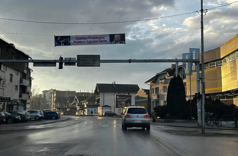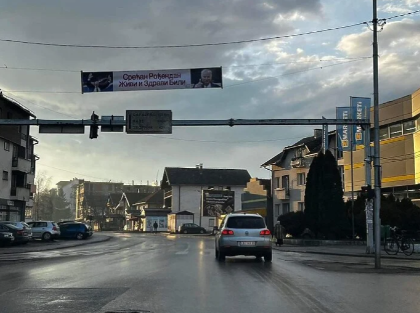 Na transparentu s Mladićevim likom piše "Srećan rođendan, živi i zdravi bili". To je postavljeno na glavnoj raskrsnici u Bratuncu, a što je svega nekoliko kilometara od Memorijalnog centra Potočari.