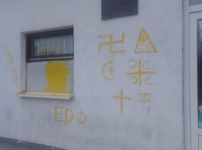 Zid Osnovne škole "Harmani" u Golubiću kod Bihaća, danas je bio na meti vandala. Žutom bojom, neko ko je zaboravio primiti kućni odgoj, vaspitanje, a nije bio ni na časovima historije u školi ili neko ko je jednostavno kreten, odlučio je svoj bijes iskaliti na zidu osnovne škole.