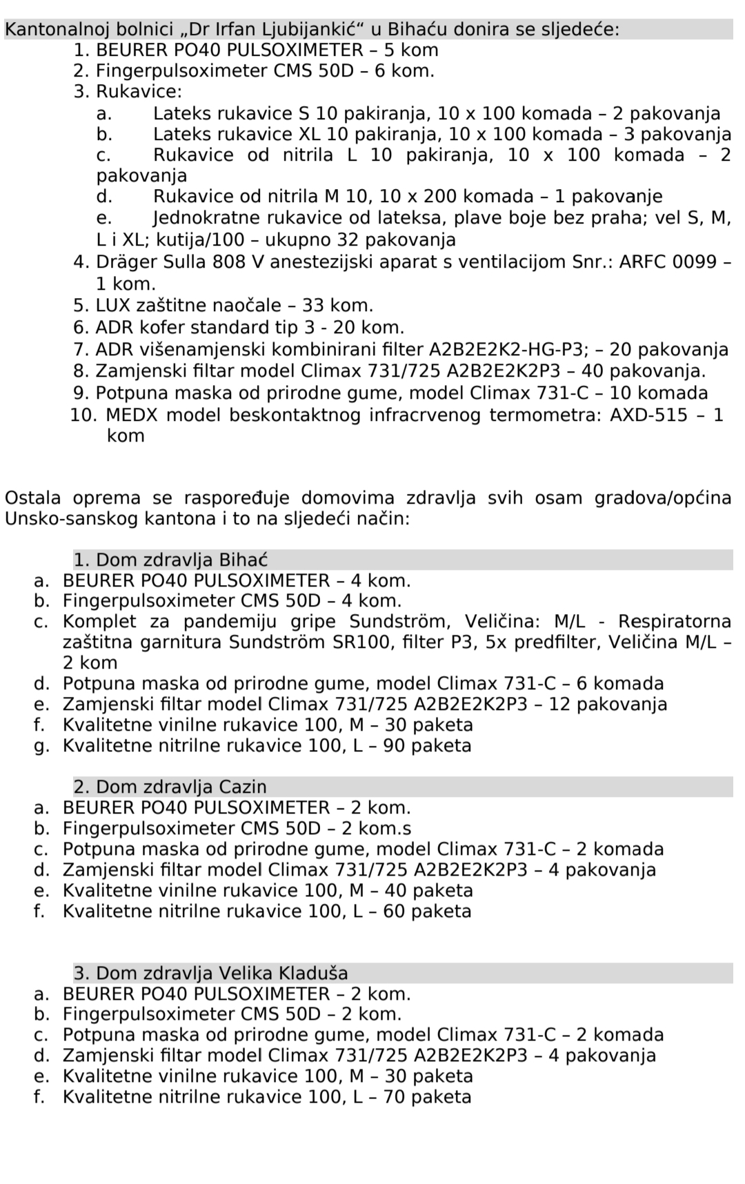 Riječ je o kamionu koji dolazi iz Austrije i trebao bi već danas da bude ispred Kantonalne bolnice u Bihaću. Vrijednost donacije koja obuhvata raznovrsnu medicinsku opremu, svjetskog kvaliteta je 18.813 eura. U prilogu članka se nalazi cjelokupni sadržaj te način raspodjele donacije!