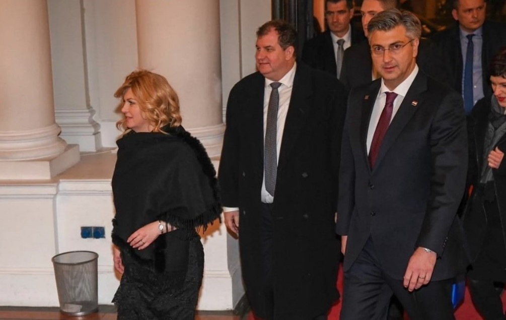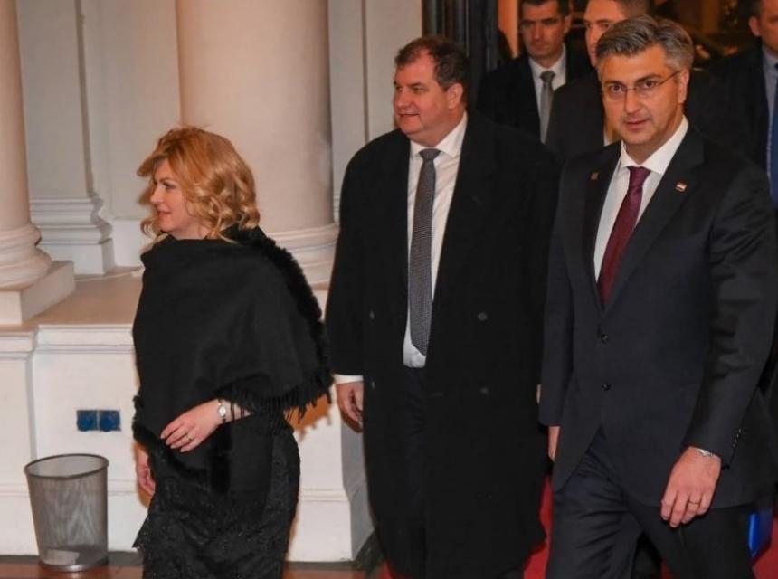 U istoj su loži sjedili predsjednica na odlasku Kolinda Grabar-Kitarović, njen suprug Jakov, predsjednica EVropske komisije Ursula van der Lejen (von der Leyen) i premijer Andrej Plenković.