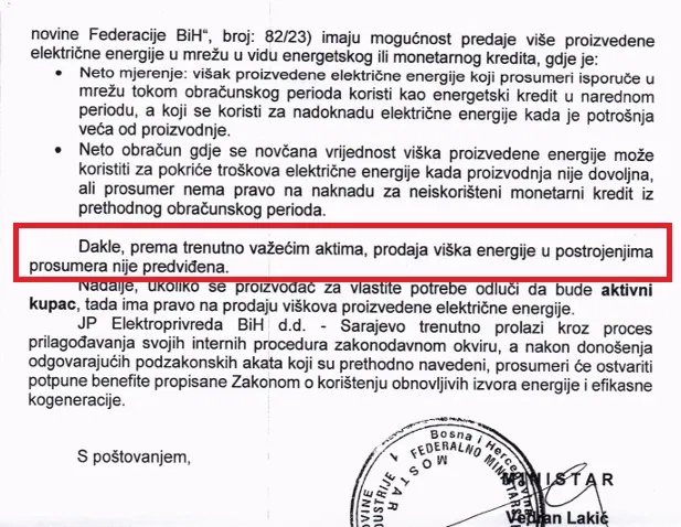 Iz Ministartva, pak, napominju da prema trenutno važećim aktima prodaja viška energije u postrojenjima prosumera nije predviđena.