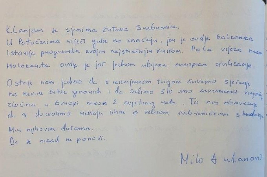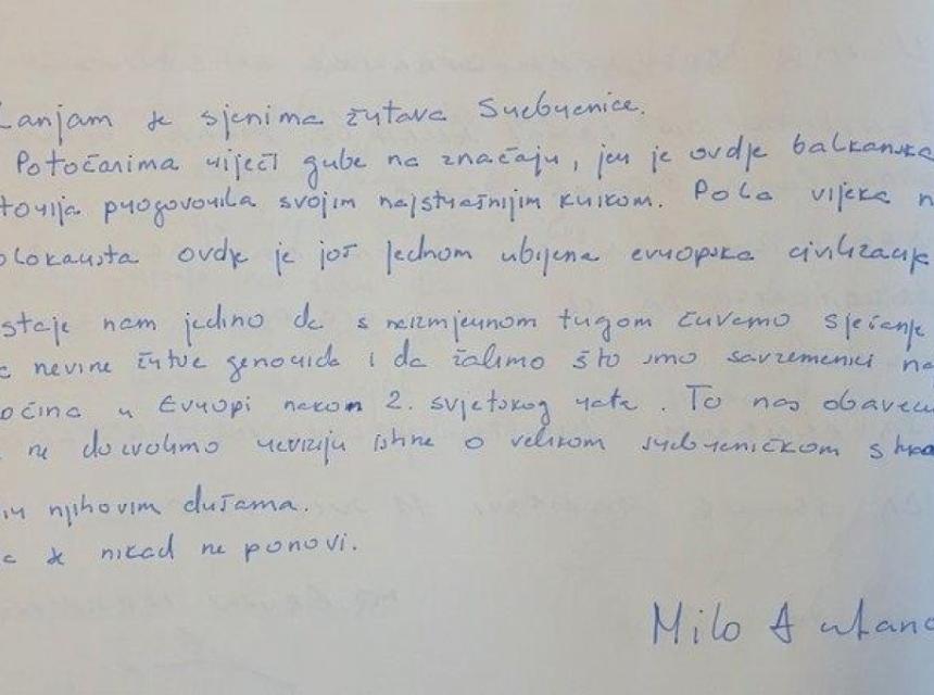 -Klanjam se sjenama žrtava Srebrenice. U Potočarima riječi gube na značaju, jer ovdje je balkanska istorija progovorila svojim najstrašnijim krikom. Pola vijeka nakon holokausta ovdje je još jednom ubijena evropska civilizacija. Ostaje nam jedino da sa neizmjernom tugom čuvamo sjećanje na nevine žrtve genocida i da žalimo što smo saveznici najvećeg zločina u Evropi nakon II Svjetskog rata. To nas obavezuje da ne dovodimo reviziju istine o velikom srebreničkom stradanju. Mir njihovim dušama, da se nikada ne ponovi, napisao je Đukanović .