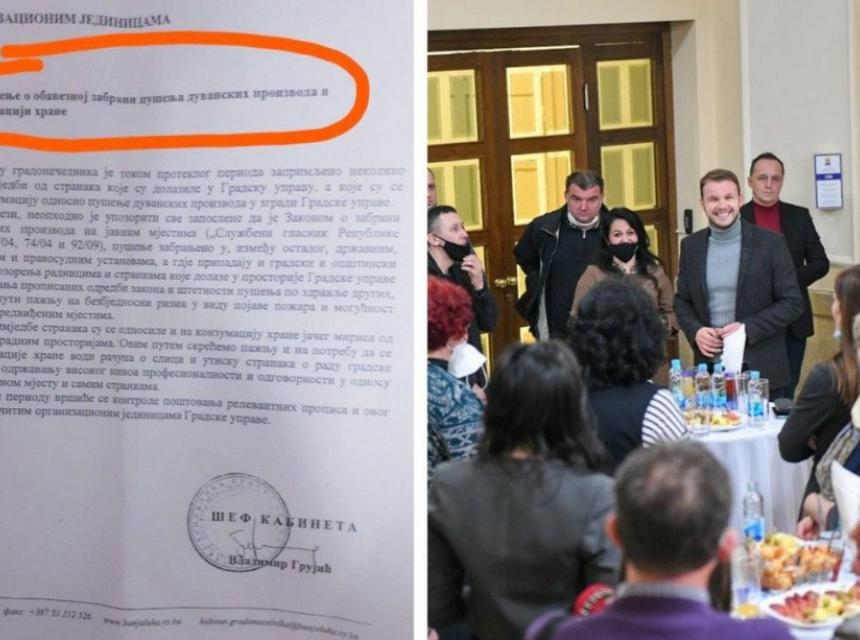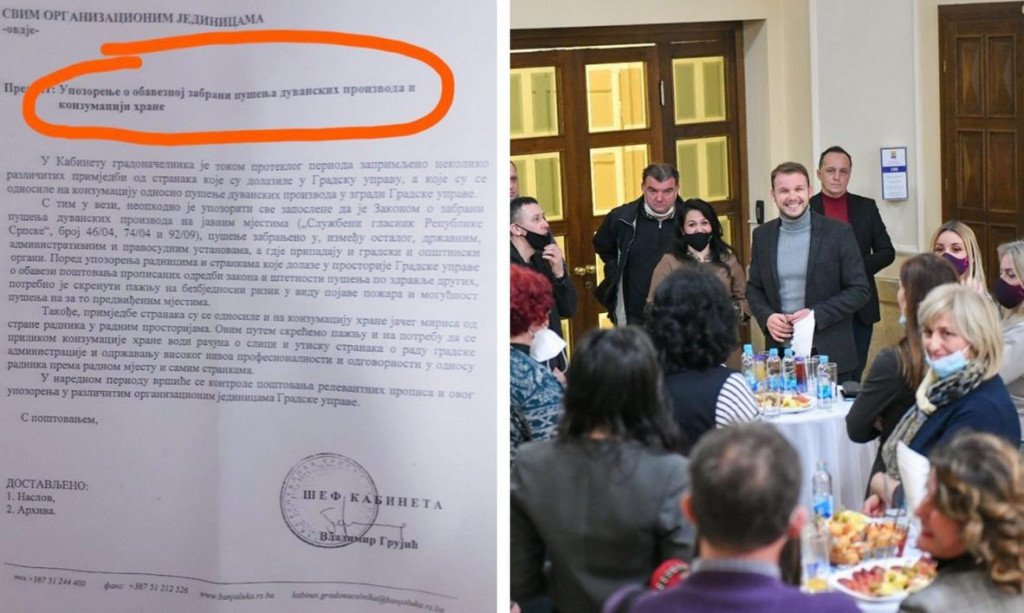 Iz kabineta gradonačelnika Banjaluke Draška Stanivukovića poručili su zaposlenima da je zabranjeno pušenje duhanskih proizvoda i konzumacija hrane u Gradskoj upravi.