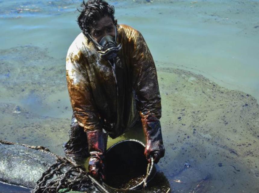 Mještani u nedjelju uz pomoć cijevi napravljenih od slame pokušavaju 'pokupiti' naftu i spriječiti njezino daljnje otjecanje u ocean. Neki su dobrovoljno angažirani na čišćenju plaža.