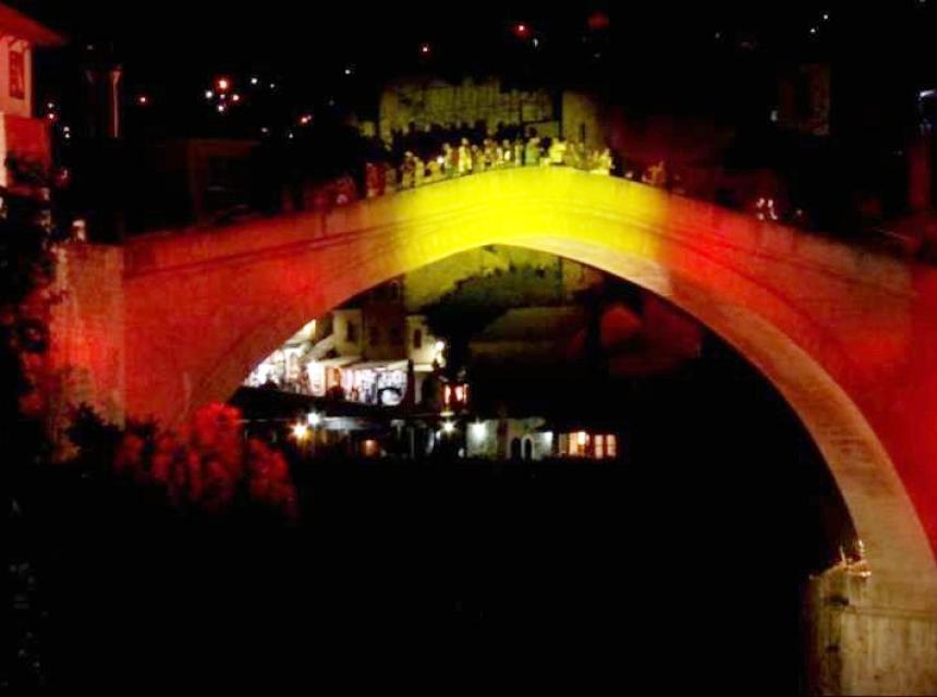 U počast nevinim žrtvama terorističkog napada u Barceloni večeras je Stari most u Mostaru, kao svjetski spomenik mira, bio u bojama zastave Španije.