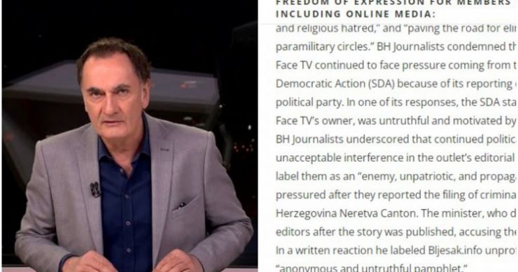 Sarajevska “Face TV” nastavila je da se suočava s pritiscima vladajuće bošnjačke etnonacionalističke Stranke demokratske akcije (SDA) zbog izvještavanja o slučajevima korupcije u vezi sa ovom političkom strankom. SDA je u jednom od svojih odgovora navela da je izvještavanje Senada Hadžifejzovića, vlasnika Face TV-a, neistinito i motivisano “povrijeđenom sujetom, ljutnjom ili nekim drugim motivima”.