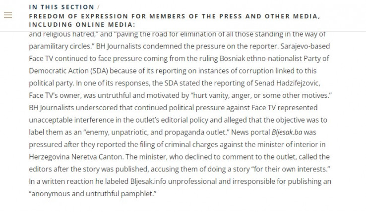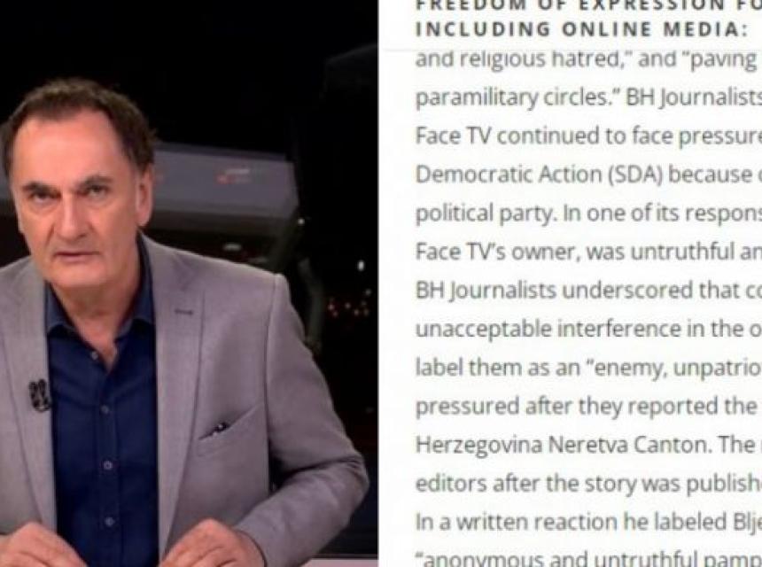BH novinari su istakli da nastavak političkog pritiska na Face TV predstavlja neprihvatljivo miješanje u uređivačku politiku te kuće i naveli da je cilj bio etiketiranje kao “neprijateljski, nepatriotski i propagandni medij” – navodi se u izvještaju State departmenta.