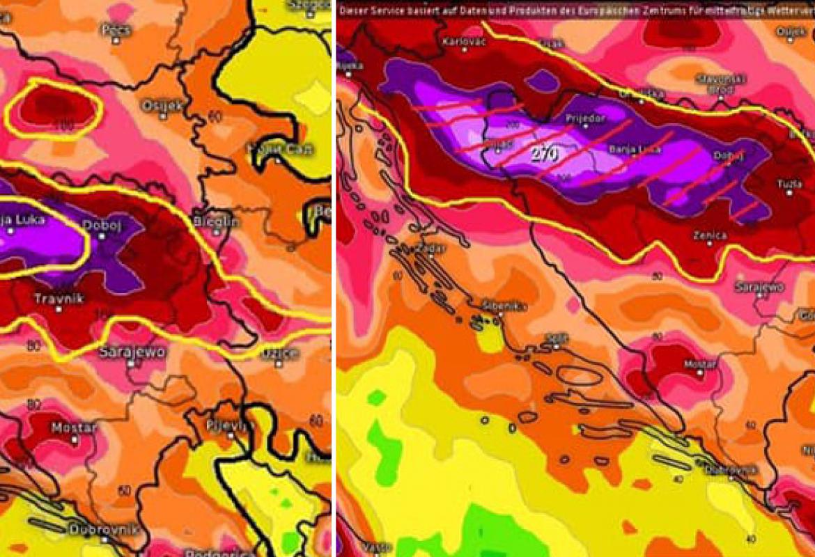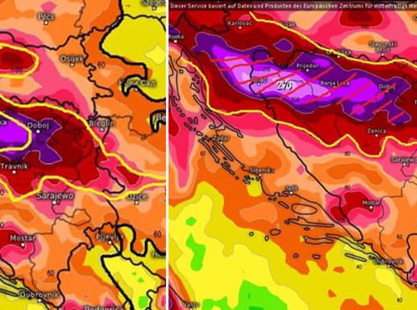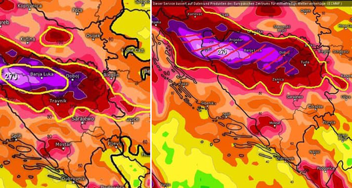 Londonski ECMWF ukazuje preko 250 milimetara taloga u u Krajini i oko 200 milimetara u okolini Doboja i Prnjavora. Kiše će pasti najmanje 90 milimetara što se može zaključiti da bi cijela Bosna bila u kritičnom stanju. Opasnost nije samo sa rijekama,opasnost je i sa kanalizacijskim vodotocima gdje bi bilo i lokalnih poplava