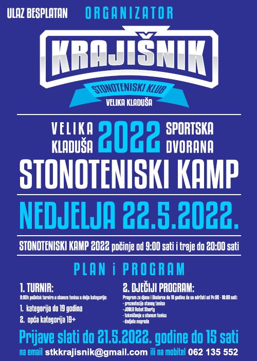 U sklopu Stonoteniskog kampa planirano je i održavanje turnira za rekreativce i profesionalnce u kategoriji do 19 godina i opća kategorija 19+. Turnir će se igrati u nedjelju od 09:00h a prijave su besplatne. Prijaviti se možete do subote, 21.maja do 15 sati na kontakt telefon 062 – 135 – 552 ili na e-mail: stkkrajisnik@gmail.com Za tri prvoplasirana takmičara obezbjeđeni su pehari i medalje.