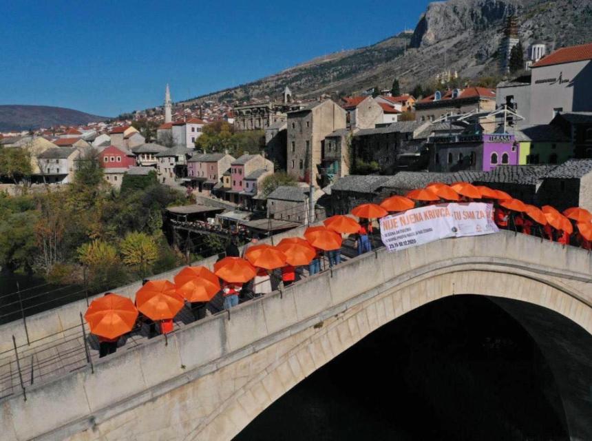 Građani Mostara koji su danas prolazili starim dijelom grada imali su priliku vidjeti veliki transparent koji se nalazio na Starom mostu s natpisom ''Nije njena krivica, tu sam za nju'', saopćeno je iz ove nevladine organizacije.