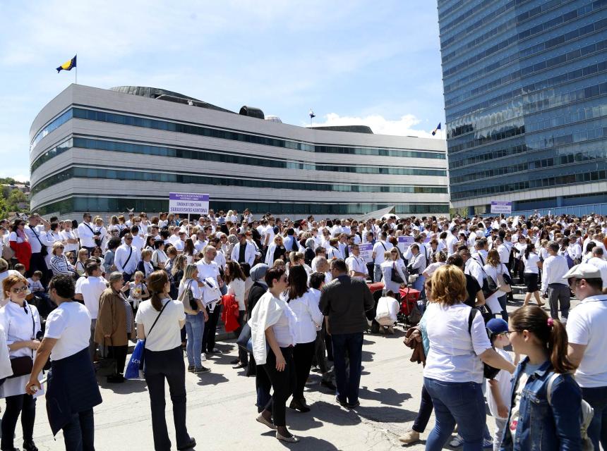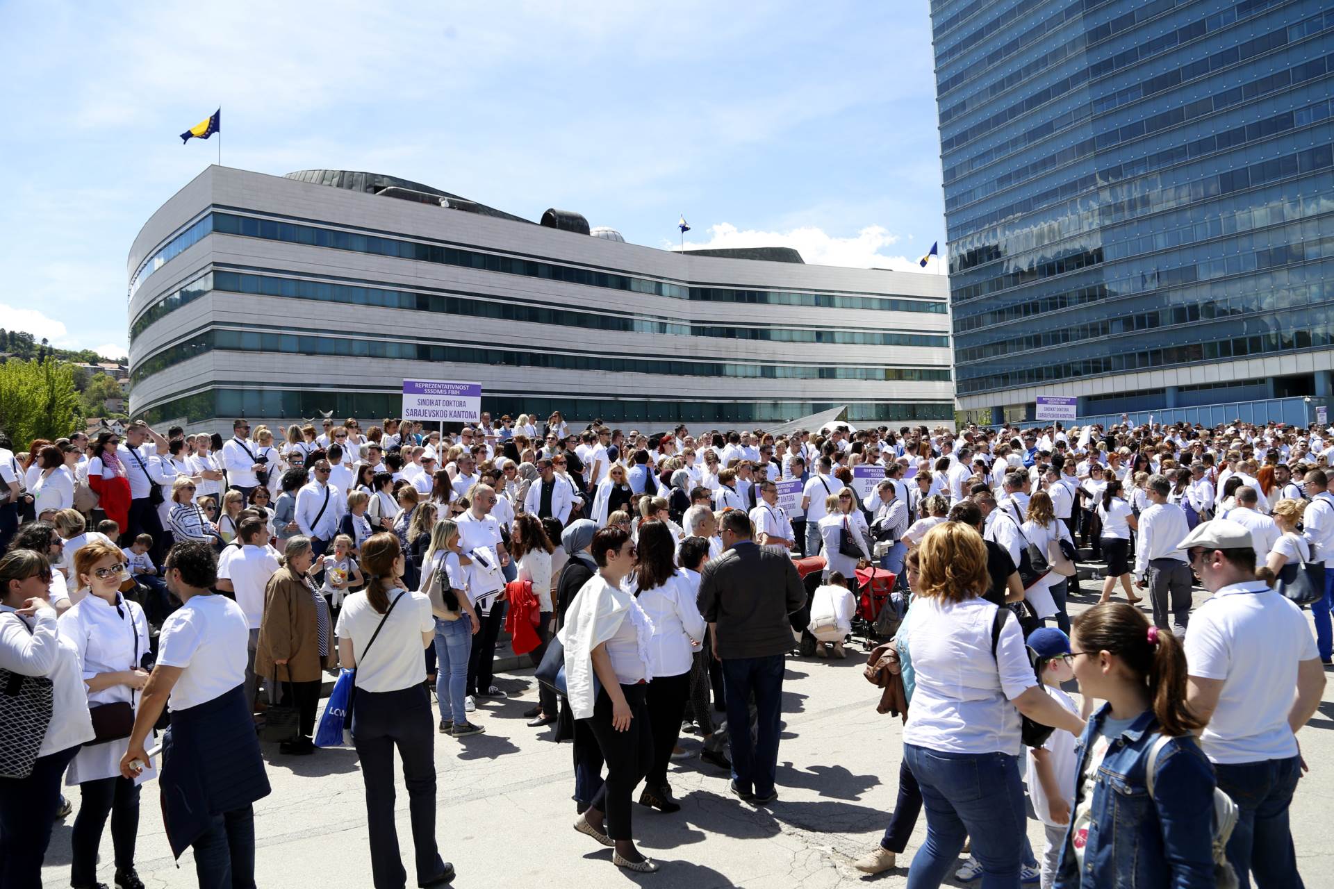 Doktori medicine i stomatologije FBiH iz deset kantona okupili su se na Trgu BiH u Sarajevu, ispred zgrade institucija BiH, nakon čega je upriličena mirna šetnja do zgrade Federalnog parlamenta.