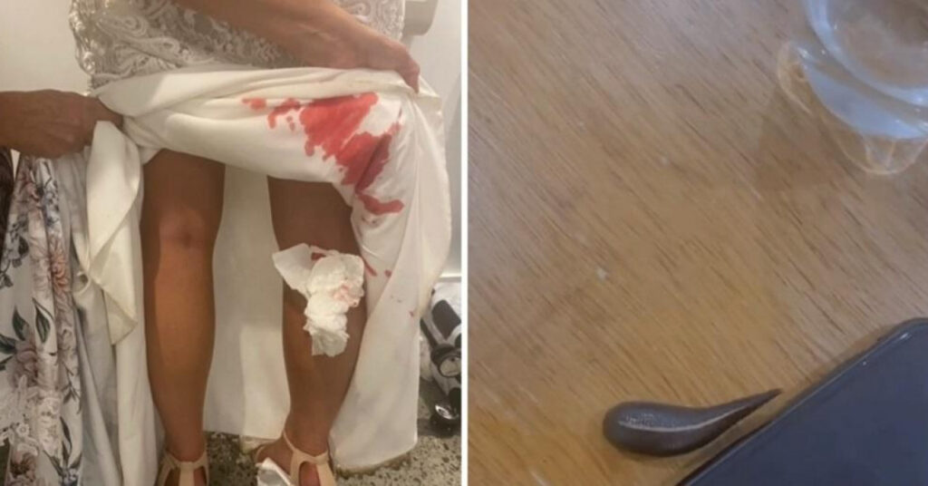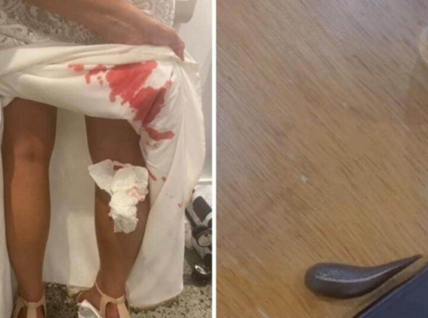 “Ovo smo otkrili ispod moje haljine nekoliko minuta nakon našeg prvog plesa…”, napisala je dok je kamera snimila njezinu krvlju umrljanu vjenčanicu.