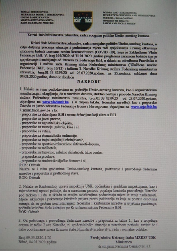 U potpisu Naredbe je predsjednica Kriznog štaba MZRSP USK, ministrica zdravstva, rada i socijalne politike Unsko-sanskog kantona, dr.sci.prim.Nermina Ćemalović.