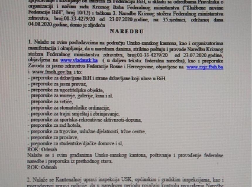 Krizni štab Ministarstva zdravstva, rada i socijalne politike Unsko-sanskog kantona, u cilju daljnjeg praćenja situacije i poduzimanja mjera radi sprječavanja i ranog otkrivanja slučajeva bolesti izazvane novim koronavirusom (COVID -19), koja je Zaključkom Vlade Federacije BiH, V. broj 164/2020 od 31.01.2020. godine proglašena zaraznom bolešću čije je sprječavanje i suzbijanje od interesa za Federaciju BiH, u skladu sa odredbama Pravilnika o organizaciji i načinu rada Kriznog štaba Federalnog ministarstva (“Službene novine Federacije BiH”, broj 10/12) i tačkom 3. Naredbe Kriznog stožera Federalnog ministarstva zdravstva, broj:01-33-4279/20 od 23.07.2020.godine, na 35.sjednici, održanoj dana 04.08.2020.godine, donio je naredbu kojom se nalaže svim poslodavcima na području Unsko-sanskog kantona, kao i organizatorima manifestacija i okupljanja, da u narednim danima, striktno poštuju i provode Naredbu Kriznog stožera Federalnog ministarstva zdravstva, broj:01-33-4279/20 od 23.07.2020.godine, objavljena na www.vladausk.ba ( u daljem tekstu: federalna naredba), kao i preporuke Zavoda za javno zdravstvo Federacije Bosne i Hercegovine, objavljene na www.zzjz.fbih.ba i www.fmoh.gov.ba.