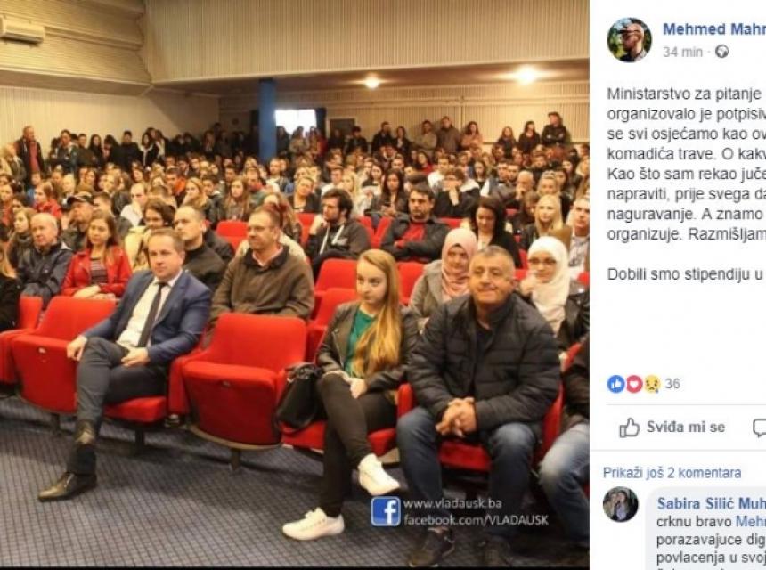 Ministarstvo za pitanje boraca i ratnih vojnih invalida Vlade Unsko-sanskog kantona organizovalo je jučer u Bihaću, dva dana pred Opće izbore, potpisivanje ugovora sa stipendistima ovom Ministarstva. Studentima se obratio i premijer USK Husein Rošić. Razočaran razlozima i načinom realizacije stipendije, student Mehmed Mahmutović napisao je upečatljiv Facebook komentar koji ovom prilikom prenosimo u cjelosti: