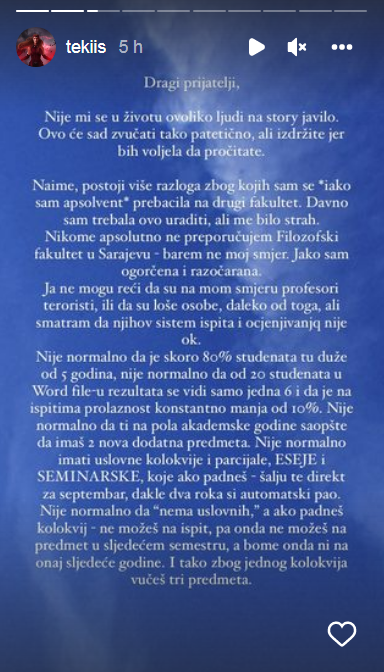 Studentica koja se predstavlja pod imenom “tekiis” na svom Instagram profilu objavila je da napušta Filozofski fakultet Univerziteta u Sarajevu.