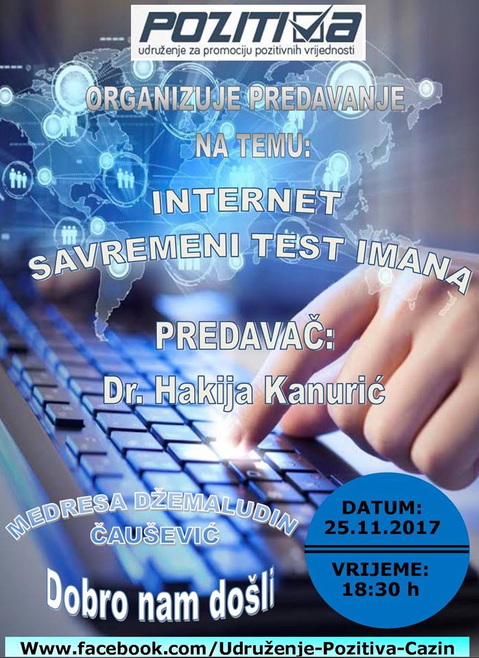 Naime, od 18:30 sati u Medresi "Džemaluddin Čaušević" moći ćete prisustvovati predavanju na temu "Internet, savremeni test imana".