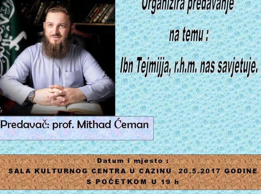 Još jedno prigodno predramazansko druženje održat će se u subotu, 20. maja. 2017. godine. Predavanje održava uvaženi prof. Mithad Ćeman koji nam dolazi u goste iz Sarajeva. Predavat će na temu "Ibn Tejmijja, r.h.m. nas savjetuje"