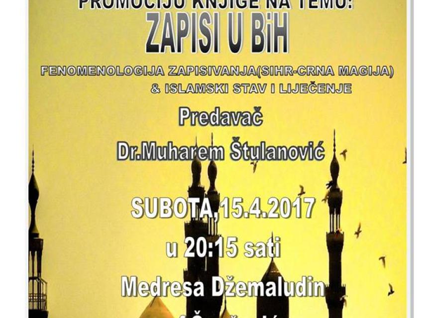 U subotu, 15. aprila 2017. godine, predavanjem će nas počastiti dr. Muharem Štulanović, profesor na IPF-u u Bihaću. Štulanović održat će predavanje i promociju knjige na temu "Zapisi u BiH".