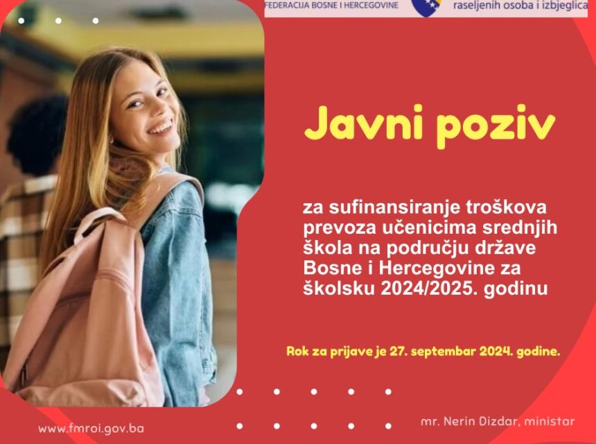 Predmet javnog poziva je sufinansiranje troškova prevoza učenicima srednjih škola na području države Bosne i Hercegovine za školsku 2024/2025 godinu.