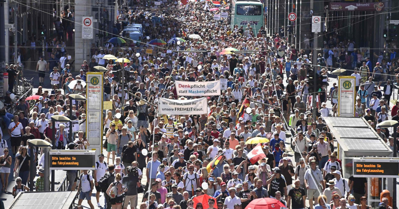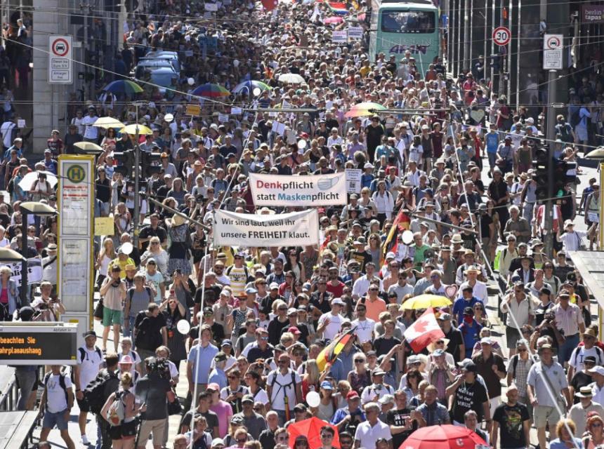 “Mir, sloboda, ne diktaturi!” uzvikivali su demonstranti, noseći njemačke zastave i transparente na kojima je pisalo da mjere blokade potkopavaju vrijednosti koje su zagarantovane Ustavom.