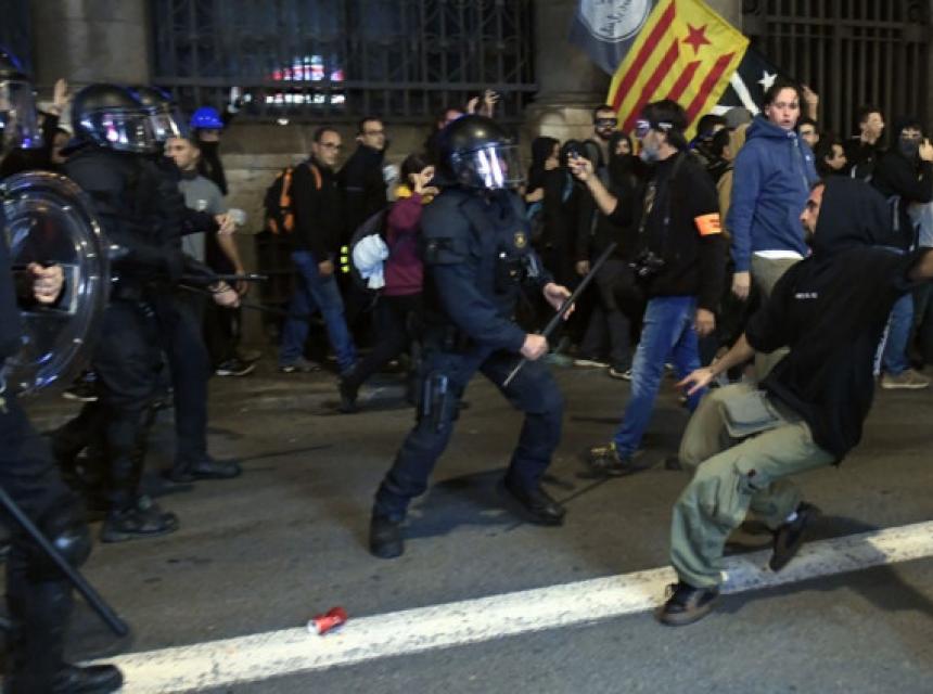 Više desetina policajaca u opremi za suzbijanje nereda rastjeruje demonstrante ispred sjedišta policije u centru Barcelone.