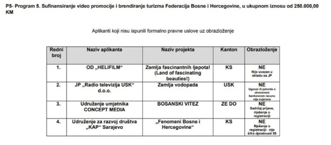 U programu 5, za koji su se prijavili (sredstva 150.000 KM minimalno i 250.000,00 KM maksimalno) trebala su biti dodijeljena jednom projektu/firmi jer cijeli projekat trebao je biti napisan tako da se ta sredstva opravdaju (jasno je naglašeno minimalno i maksimalno).