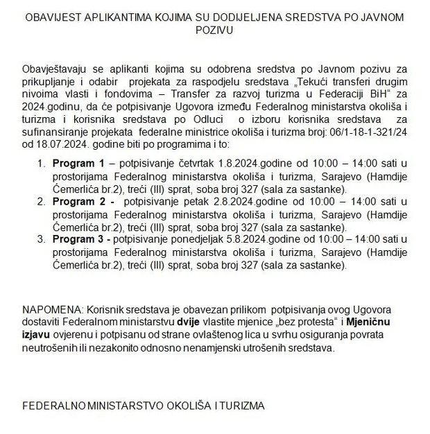 "Sredstva transfera za turizam će biti i naredne godine, jer je to jedan od vidova poticaja razvoju turizma putem Budžeta FBiH. Stoga smo i Vaš komentar/primjedbu uobzirili kako bismo naprijedili proces. Molimo Vas da pratite javne pozive, te da razmotrite mogućnost prijave na iste, ukoliko bude ovakvih ili sličnih programa."