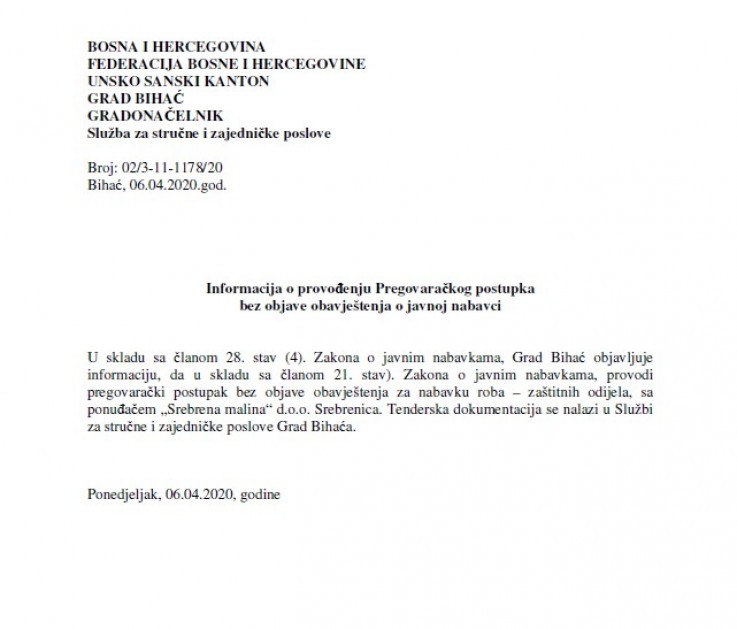 Naime, ime ove firme našlo se u pod lupom Agencije za javne nabavke i Tužilaštva USK kada je riječ nabavci zaštitnih odijela za potrebe Grada Bihaća, a odluka o nabavi objavljena je 6. aprila.