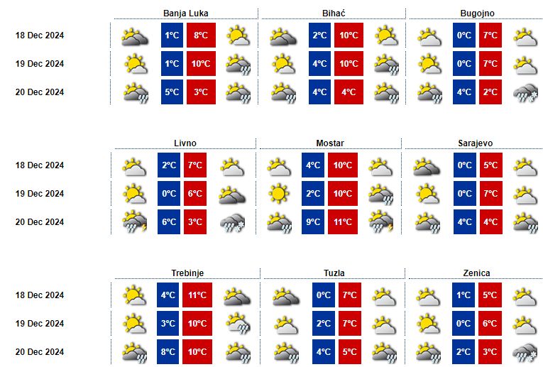 U petak, pretežno oblačno vrijeme sa kišom. Poslije podne ili tokom noći u nizinama centralne, istočne i zapadne Bosne očekuje se prelazak kiše u susnježicu i snijeg. Vjetar slab do umjeren prije podne južni i jugozapadni, a poslije podne postepeno mijenja smjer na sjeverni i sjeverozapadni. Tokom noću u Hercegovini i zapadnim područjima Bosne povremeno jaki udari vjetra. Jutarnja temperatura zraka od 2 do 8, na jugu do 10, a dnevna od 4 do 10, na jugu do 14 stepeni.