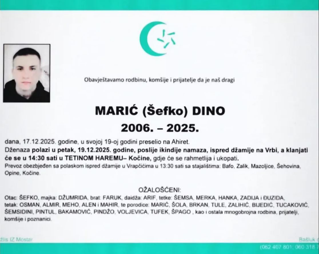 19-godišnji Dino Marić preminuo je jučer, a vijest o njegovoj smrti podijelila je JU Srednja elektrotehnička škola "Salih-Salko Ćurić" Mostar.