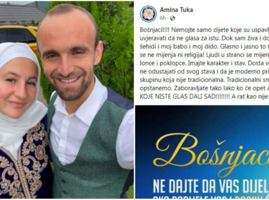 Znam da nije moderno biti vjernik i još k tome ne odustajati od svog stava i da je moderno priklanjati se drugima ali prestanite više glumiti skupinu koja nije tradicionalna. Tradicionalni smo i takvi i treba da ostanemo, ako želimo da opstanemo. Zaboravljate tako lako ko će opet ako rata bude stati na prvu liniju. Većina onih za koje niste glas dali sad! A rat kao nije blizu, jel - napisala je Amina Tuka.