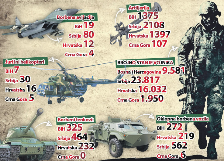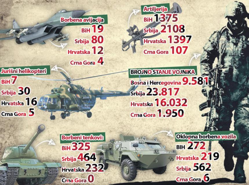 - Znači, kada globalno govorimo o efektivnom balansu snaga, trenutna situacija je vrlo jasna. Srbija ima izvanrednu prednost u odnosu na sve druge zemlje u regionu, zatim slijedi Hrvatska, koja je modernizirala svoje oklopne transportere, a sada nabavljaju četiri nova helikoptera. Crna Gora je dobila 40 ili 50 novih oklopnih vozila i do sada su ostvarili napredak. BiH, jednostavno, stoji zbog unutrašnjih proturječnosti, prvo entitetskih, a onda i političkih struktura unutar dva entiteta - ocjenjuje Zečević.