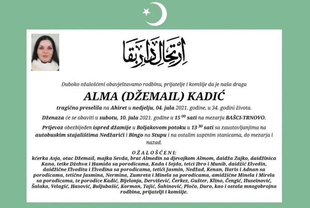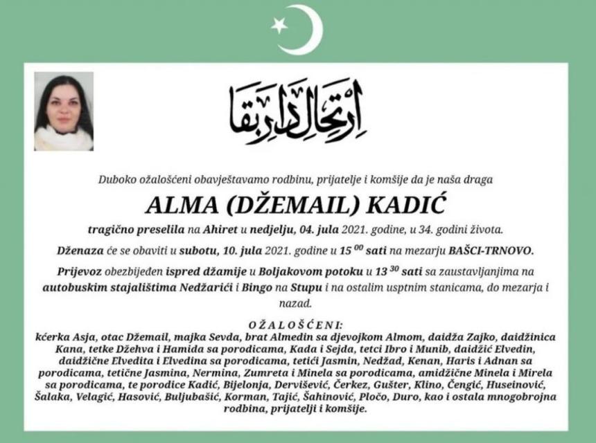 Tragično preminuloj Almi Kadić u subotu će biti obavljena dženaza i to na mezarju Bašci u Trnovu.