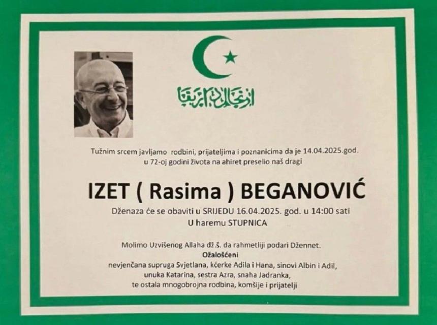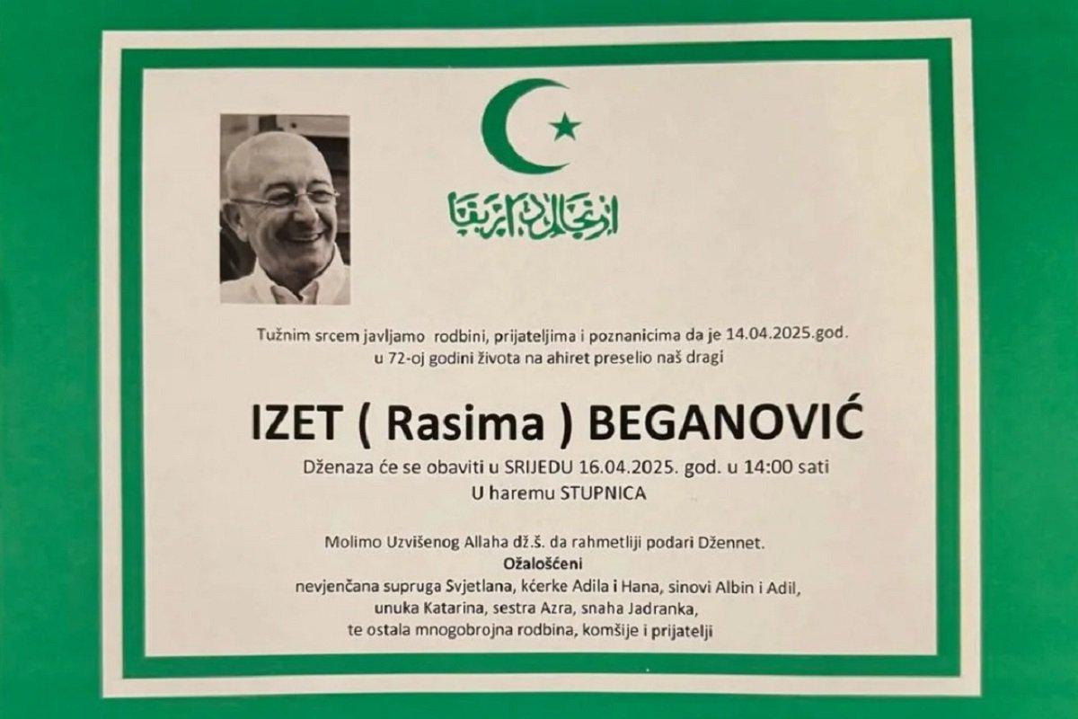 BANJALUKA - Izet Beganović, biznismen iz Banjaluke, koji je juče preminuo nakon teške bolesti, biće sahranjen sutra u 14 časova u haremu Stupnica.