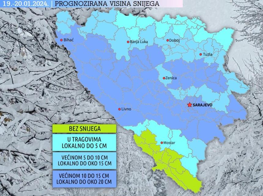 Na subotu, 20.01.2024., najavljuje se nastavak snijega u centralnim i istočnim dijelovima Bosne i većem dijelu Hercegovine prije podne, dok se širenje oblačnosti predviđa za drugi dio dana.