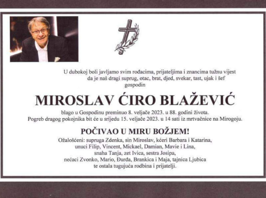 Sahrana će se održati u srijedu, 15. februara 2023. godine, u 14,00 sati u Aleji velikana na gradskom groblju Mirogoj u Zagrebu.