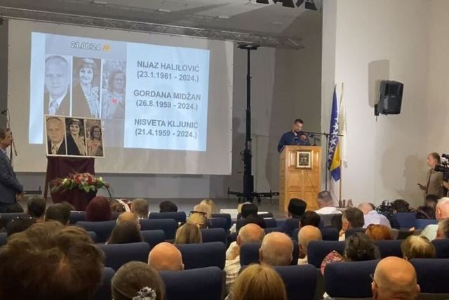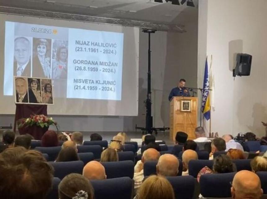 U prepunom gradskom kinu u Sanskom Mostu održana je komemoracija ubijenom direktoru sanske gimnazije Nijazu Haliloviću, sekretarici Nisveti Kljunić i profesorici engleskog jezika Gordani Midžan.