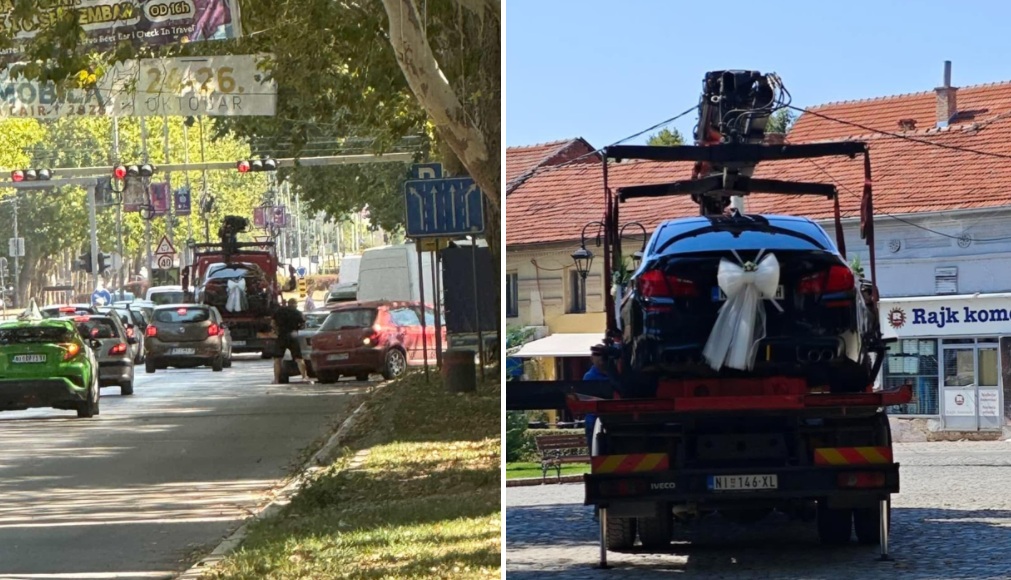 Neobična i pomalo komična scena zabilježena je u Nišu, gdje je svadbeni automobil, ukrašen cvijećem i mašnama, završio na kamionu pauk-službe. Fotografija se ubrzo pojavila na Instagram stranici nishnocu_oficijalni i postala viralna, izazvavši lavinu komentara.